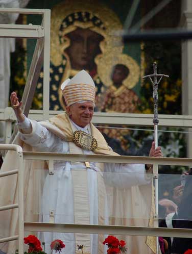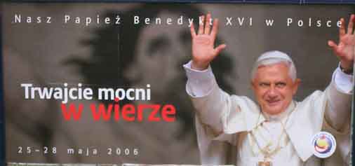 Na plakacie widzimy na pierwszym planie Papieża Benedykta XVI oraz napisy o pielgrzymce, daty i hasło pielgrzymki.